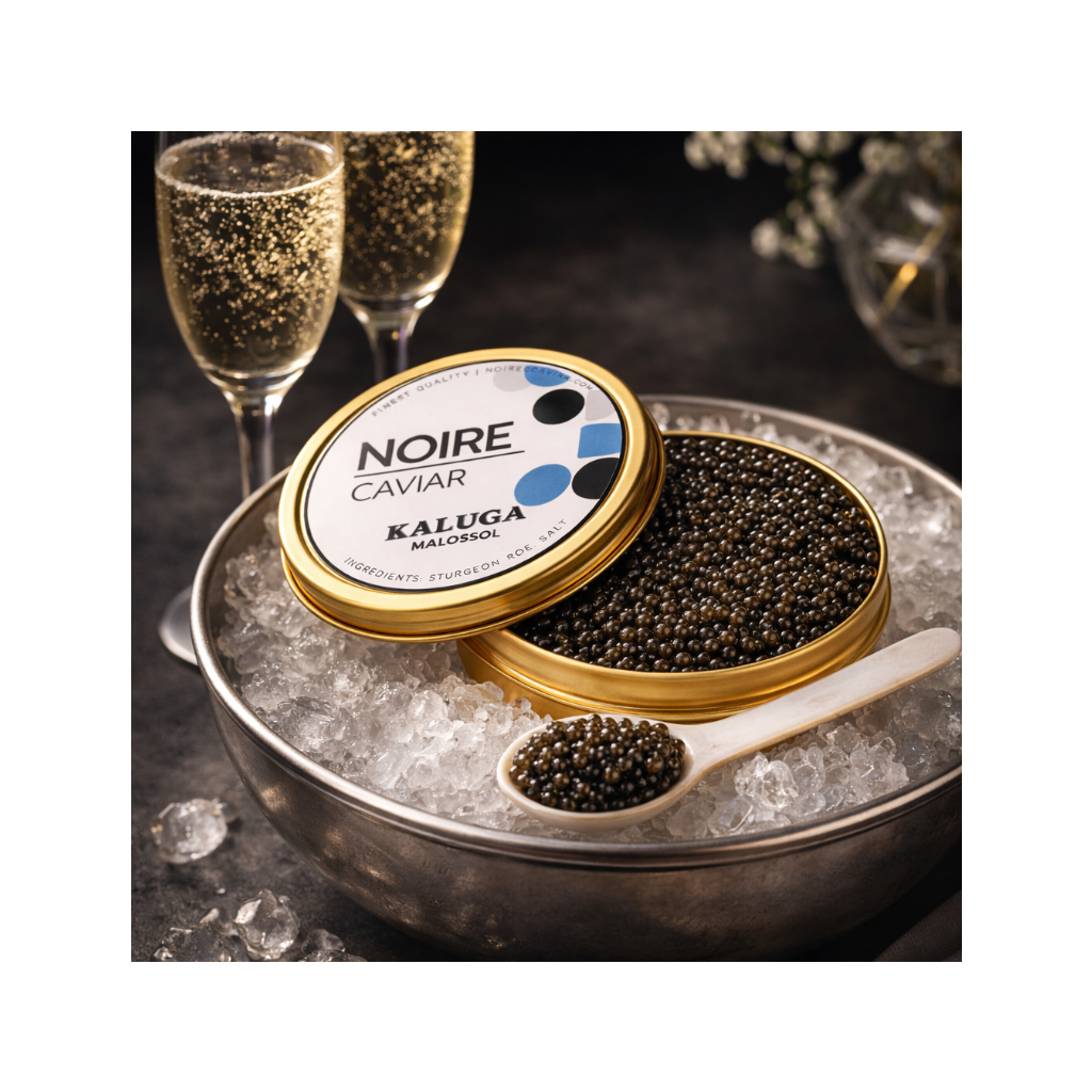 Experience the refined elegance of Noire Kaluga Malossol Caviar, a premium black caviar crafted from sustainably farmed Kaluga sturgeon. Known for its smooth texture and rich, buttery flavor, Kaluga caviar is prized for its large, glossy pearls and clean, delicate finish.